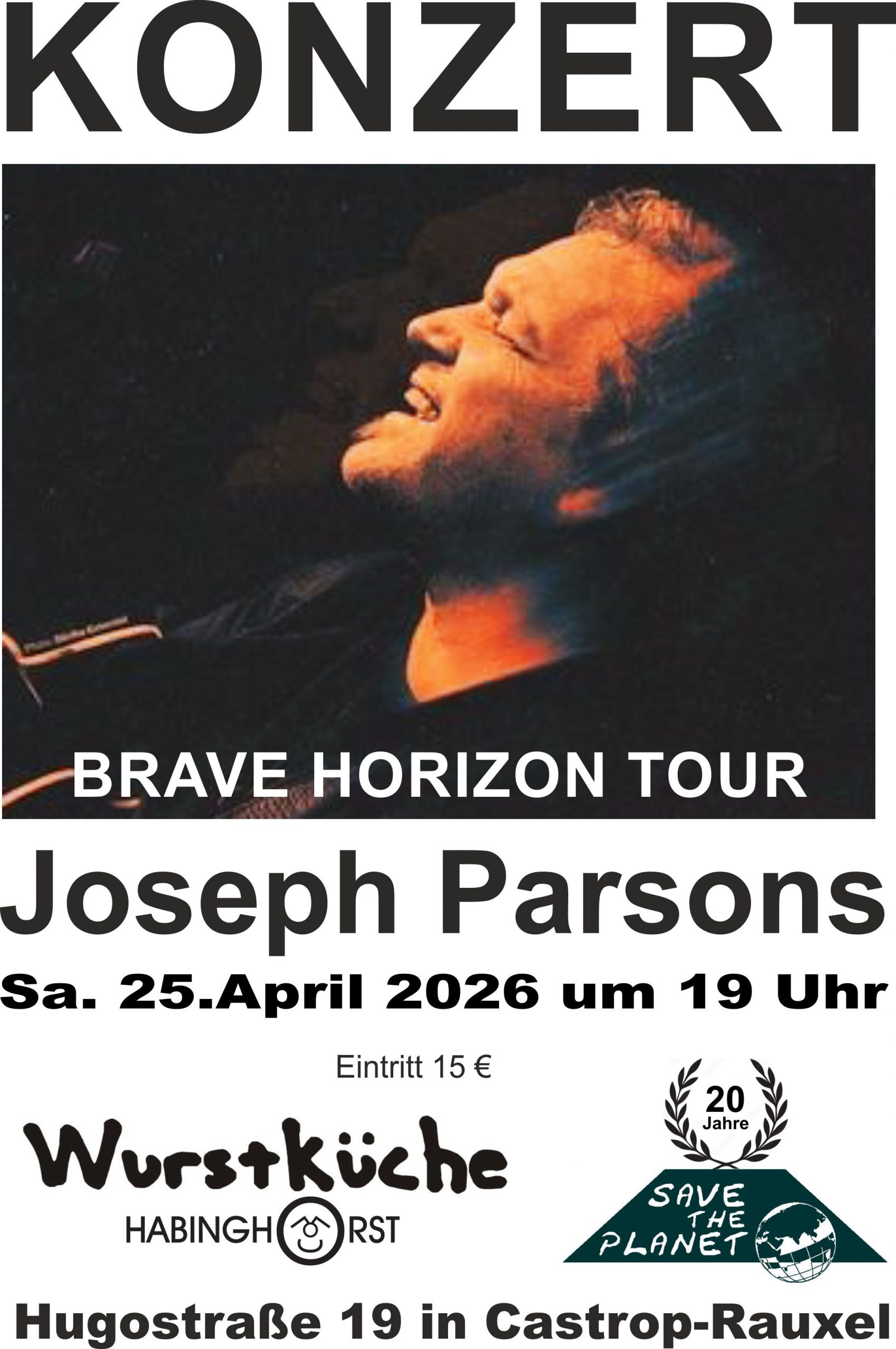 Präsentiert SAVE THE PLANET in der Wurstküche, den in Europa lebenden Künstler, Songwriter und Performer Joseph Parsons, der für seine genreübergreifenden, emotionalen Rock-&-Roll-Songs und spannenden Live-Shows bekannt ist.